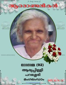 മംഗലംഡാം : പറശ്ശേരിആര്യപ്പിള്ളി റോസമ്മ (92) അന്തരിച്ചു. സംസ്കാരം ഇന്നു 2.30 ന് മംഗലംഡാം സെന്റ് സേവ്യേഴ്സ് ഫൊറോന...