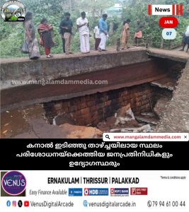 മംഗലംഡാം : വലതുകര കനാലിന്റെ മക്കത്തിൽ അണക്കെട്ടിനോടുചേർന്ന് ചെറുകുന്നം പുഴയ്ക്കുകുറുകെയുള്ള കനാൽപ്പാലത്തിൻ്റെ ഭാഗം ഇടിഞ്ഞു താഴ്ന്നു. ഇതോടെ വലതുകര...