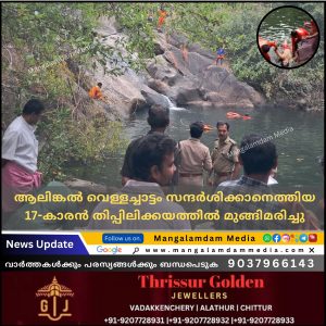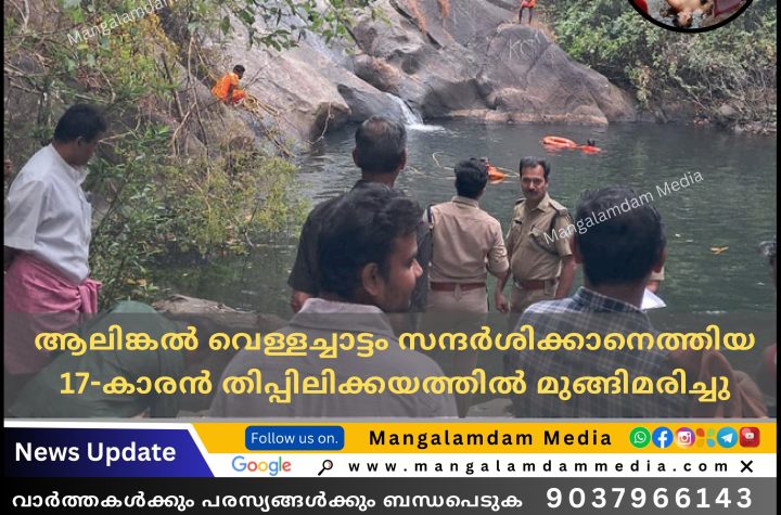 മംഗലംഡാം : ആലിങ്കൽ വെള്ളച്ചാട്ടം കാണാനെത്തിയ സംഘത്തിലെ 17-കാരൻ തിപ്പിലിക്കയം വെള്ളക്കെട്ടിൽ മുങ്ങിമരിച്ചു. തൃശ്ശൂർ കാളത്തോട് ചക്കാലത്തറ അക്മൽ...