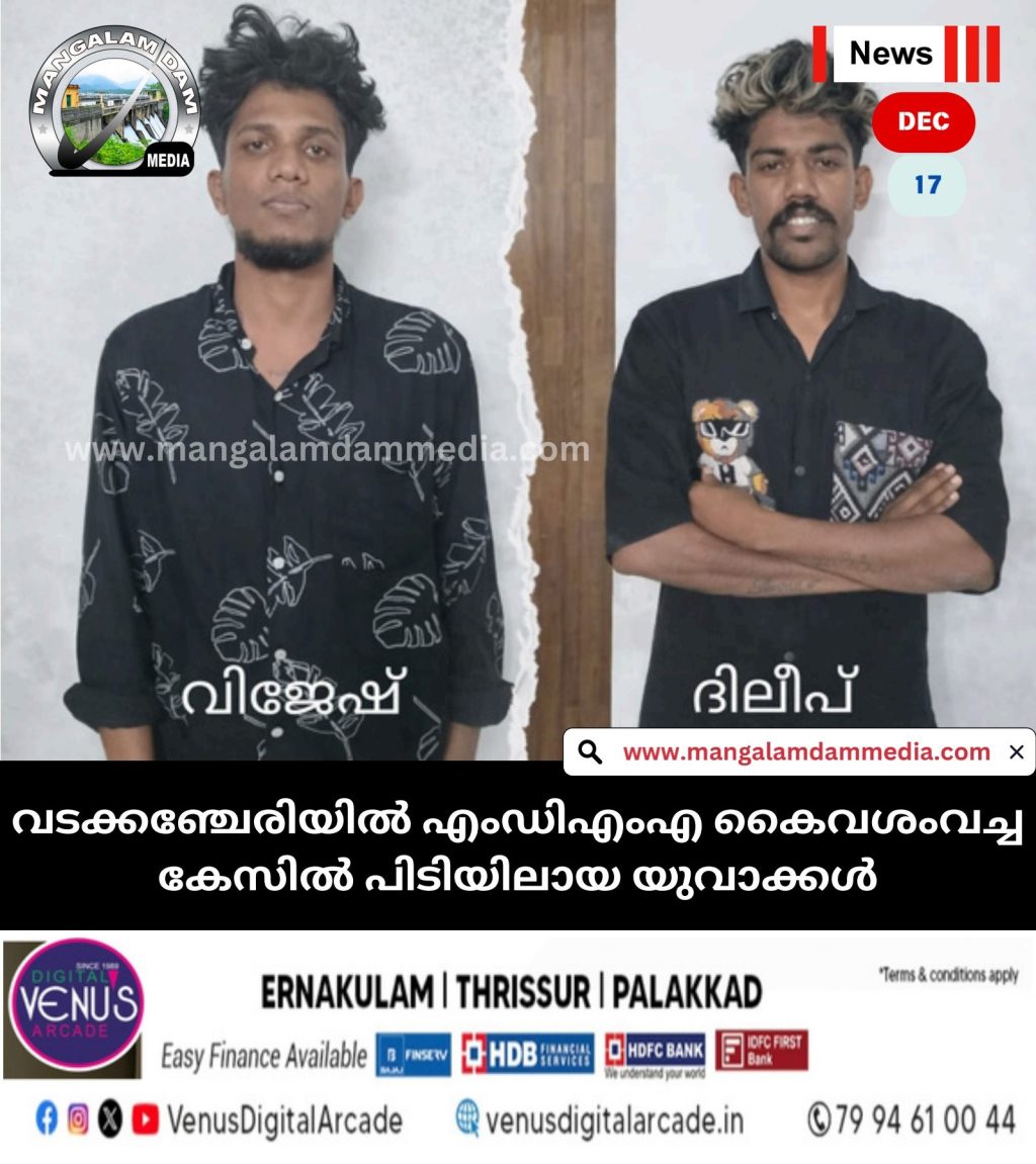 വടക്കഞ്ചേരി: കണ്ടങ്കാളി പൊറ്റയിൽ നിന്നു 8 ഗ്രാമിന് താഴെയായി എംഡിഎംഎ കൈവശംവച്ചിരുന്ന രണ്ട് യുവാക്കളെ വടക്കഞ്ചേരി പോലീസ് അറസ്റ്റ് ചെയ്തു. അഞ്ചുമൂർത്തിമംഗലം വഴുവാക്കോട് സ്വദേശി വിജേഷ്, വടക്കഞ്ചേരി ആമക്കുളം സ്വദേശി ദിലീപ് എന്നിവരാണ് പിടിയിലായത്. CI കെ.പി. ബെന്നിയുടെ നേതൃത്വത്തിൽ SI സനീഷ്, SCPO ഭാവിഷ്, KHG അഫ്സൽ, DANSAF അംഗങ്ങളായ ASI ബ്ലസൻ ജോസ്, ദേവദാസ്, SCPO റിയാസ്, SCPO ലൈജു എന്നിവർ ചേർന്നാണ് പ്രതികളെ പിടികൂടിയത്.