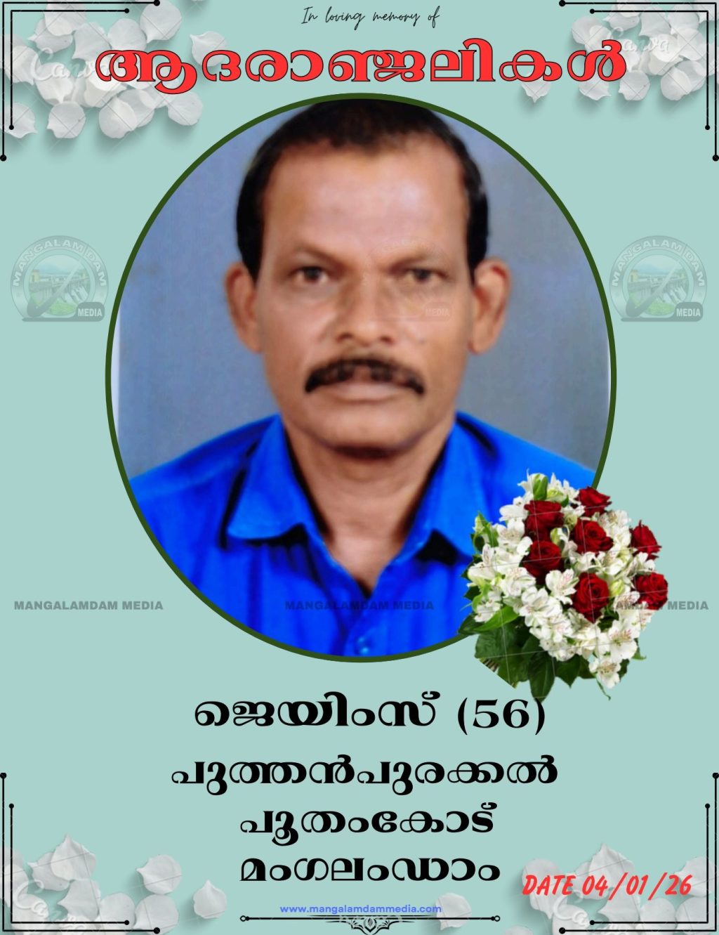 മംഗലംഡാം : പൂതംകോട്, പുത്തൻപുരക്കൽ, ജെയിംസ് (56) നിര്യാതനായി. ഭാര്യ: മിനി. മക്കൾ: ടിനോ, ടിനി , ടിബിൻ . മരുമകൾ: സ്റ്റെഫി. സംസ്കാരം ചൊവ്വാഴ്ച (6/1/26) കാലത്ത് 10 ന് മംഗലംഡാം സെൻ്റ് സേവ്യേഴ്സ് ഫൊറോന പള്ളി സെമിത്തേരിയിൽ.