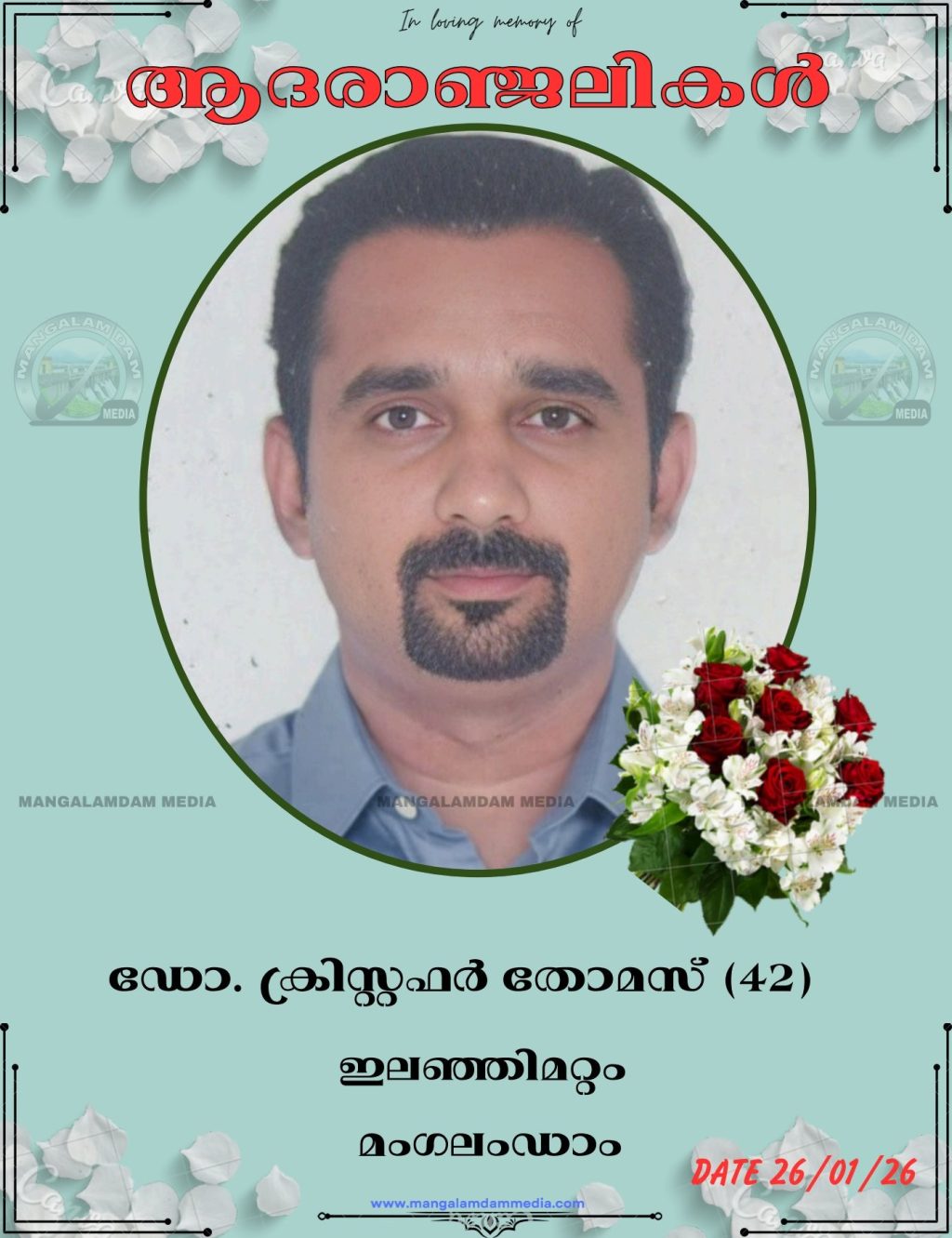 മംഗലംഡാം: ഇലത്തിമറ്റം തോമാച്ചൻ–ലീലാമ്മ ദമ്പതികളുടെ മകൻ ഡോ. ക്രിസ്റ്റഫർ തോമസ് (42) കൽക്കട്ടയിൽ നിര്യാതനായി. കൽക്കട്ടയിലെ എയിംസ് (AIIMS) മെഡിക്കൽ കോളേജിൽ അദ്ധ്യാപകനായിരുന്നു. മൃതസംസ്കാരം 28/1/2026 ബുധനാഴ്ച രാവിലെ 11:30 ന് പാലാ പൂവരണിയിലുള്ള ഇലഞ്ഞിമറ്റം തറവാട് വീട്ടിൽ ആരംഭിച്ച് പൂവരണി തിരുഹൃദയ പള്ളിയിൽ വച്ച് നടക്കും.