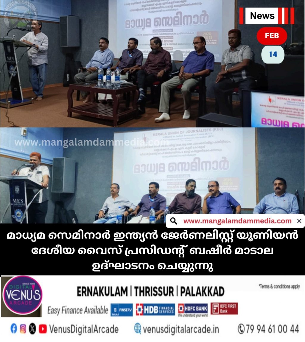 പാലക്കാട്: കേരള യൂണിയൻ ഓഫ് ജേർണലിസ്റ്റ്സ് (കെ.യു.ജെ) പാലക്കാട് ജില്ലാ കമ്മിറ്റിയും മണ്ണാർക്കാട് എം.ഇ.എസ്. കല്ലടി കോളേജിലെ ജേർണലിസം & മാസ് കമ്മ്യൂണിക്കേഷനും സംയുക്തമായി മാധ്യമ സെമിനാർ സംഘടിപ്പിച്ചു.“ഇന്ത്യൻ മാധ്യമരംഗത്തെ വർത്തമാനകാല പ്രതിസന്ധികൾ” എന്ന വിഷയത്തിൽ കോളേജിലെ ജേർണലിസം വിഭാഗം ഹാളിൽ നടന്ന സെമിനാർ ഇന്ത്യൻ ജേർണലിസ്റ്റ്സ് യൂണിയൻ ദേശീയ വൈസ് പ്രസിഡന്റ് ബഷീർ മാടാല ഉദ്ഘാടനം ചെയ്തു. കെ.യു.ജെ ജില്ലാ പ്രസിഡന്റ് ഡോ. എം. കെ. ഹരിദാസ് അധ്യക്ഷത വഹിച്ചു.മുതിർന്ന മാധ്യമ പ്രവർത്തകരായ ജഗദീഷ് ബാബു (കലാകൗമുദി), അബു ഇരിങ്ങാട്ടിരി എന്നിവർ വിഷയാവതരണം നടത്തി. കേരള യൂണിയൻ ഓഫ് ജേർണലിസ്റ്റ്സ് ജില്ലാ സെക്രട്ടറി കണക്കമ്പാറ ബാബു, സംസ്ഥാന കോർഡിനേറ്റർ ബെന്നി വർഗീസ്, എം.ഇ.എസ്. കല്ലടി കോളേജ് മാസ് കമ്മ്യൂണിക്കേഷൻ വിഭാഗം മേധാവി നസ്റിയ, കെ.യു.ജെ ഭാരവാഹികളായ അബ്ദുൽ റഹ്മാൻ (മണ്ണാർക്കാട്), മുജീബ് റഹ്മാൻ, സുനിത എന്നിവർ സംസാരിച്ചു.